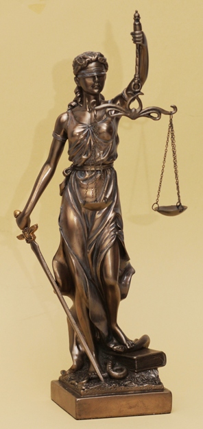 Beeld van Vrouwe Justitia, de godin van de gerechtigheid in bronskleur